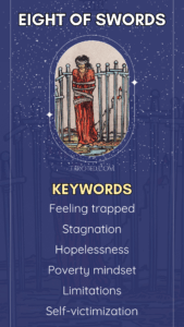 Getting the 8 of Swords in a reading represents feeling trapped, powerless, or stuck in negative thought loops. Often, the restrictions are mental traps self-imposed by fear, guilt, or limiting beliefs. It’s the prison of “what ifs” and “I can’t do this, I’ll fail.” There is a lingering sense of hopelessness and fatalism in the situation you’re asking about. Freedom and clarity are possible, but not while you’re frozen in place out of a misplaced sense of fear.