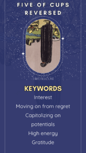 When asking about a potential career or job, the Five of Cups reversed suggests that if you’ve been doubting yourself due to past failures, you’re now at the point where you’re seeing new possibilities without the self-doubt. Instead of focusing on what didn’t work before, you’re learning from your mistakes and considering alternatives that may just work this time for you.