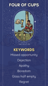 Are you single, and wondering what your love life holds for you? The 4 of Cups in this situations hints you may feel disillusioned with dating or stuck in emotional limbo. Love might be right in front of you, but you’re too preoccupied to see it. Open your heart to possibility.