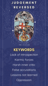 Getting Judgment reversed in a reading hints at resistance to change, self-doubt and avoiding necessary personal growth. Where Judgment upright signifies renewal, healing, and personal growth, in the reversed it suggests stagnation, denial, or a lack of self-awareness. You may be ignoring your inner voice that is urging you to grow or you may be refusing to take accountability for your life’s direction. This card can also indicate prolonged guilt, remorse over the past, or a wasted second chance.