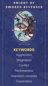If you’re asking about a current relationship, the Knight of Swords reversed suggests you or your partner is fast-talking, reactive, or always “right.” This is not an arguer to learn from—you argue to win. The Knight reversed will not bother to listen; they trample feelings underfoot with reason, or worse, sarcasm and ridicule. Or they may be emotionally unavailable but reactive if pushed. Resentment is what is cultivated with this dynamic. Beware of poison communication patterns that come disguised as intellect or “tough love.”.