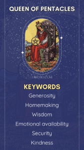 Getting the Queen of Pentacles in a tarot card reading embodies nurturing, practicality, and grounded abundance. She’s the ultimate provider by offering warmth, care, and resourcefulness. Whether in the home, finances, or emotional life, the Queen of Pentacles creates comfort and stability. She’s generous, wise, and deeply rooted.