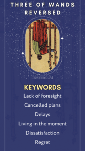 Getting Three of Wands reversed when asking about a potential career or new job is a warning about obstacles in your way. Your plans may be lacking a solid foundation, or external factors like market conditions could delay your progress. You’re being asked to research this opportunity thoroughly before taking risks and committing to anything that may fall through.